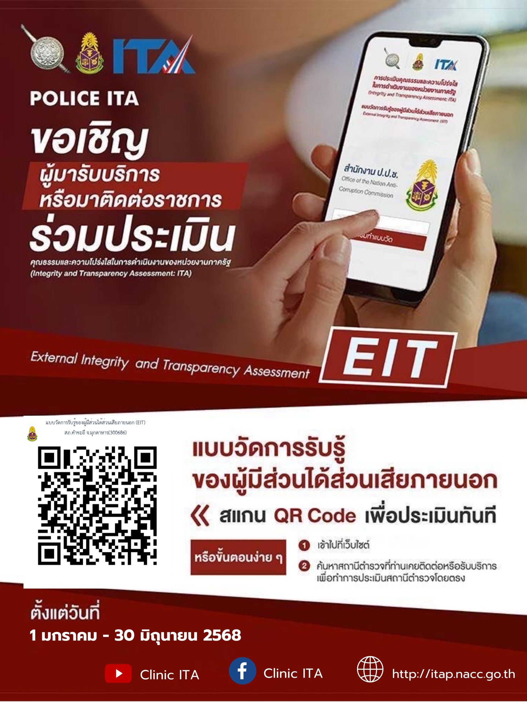เมื่อวันที่ ๑๘ ก.พ.๖๘ เวลา ๐๙.๓๐ ๐ น. พ.ต.อ.ปรกรณ์ กันยะจันทร์ ผกก.(สอบสวน) กลุ่มงานสอบสวน ภ.จว.มุกดาหาร รรท.ผกก.สภ.คำชะอี พร้อมเจ้าหน้าที่ที่เกี่ยวข้องเข้าร่วมประชุมทางไกล เรื่อง ประชุมชี่แจงการประเมินคุณธรรมและความโปร่งใสในการดำเนินงานของภาครัฐ(ITA)ของสถานีตำรวจประจำปีงบประมาณ ๒๕๖๘ ณ ห้อง ศปก.สภ.คำชะ