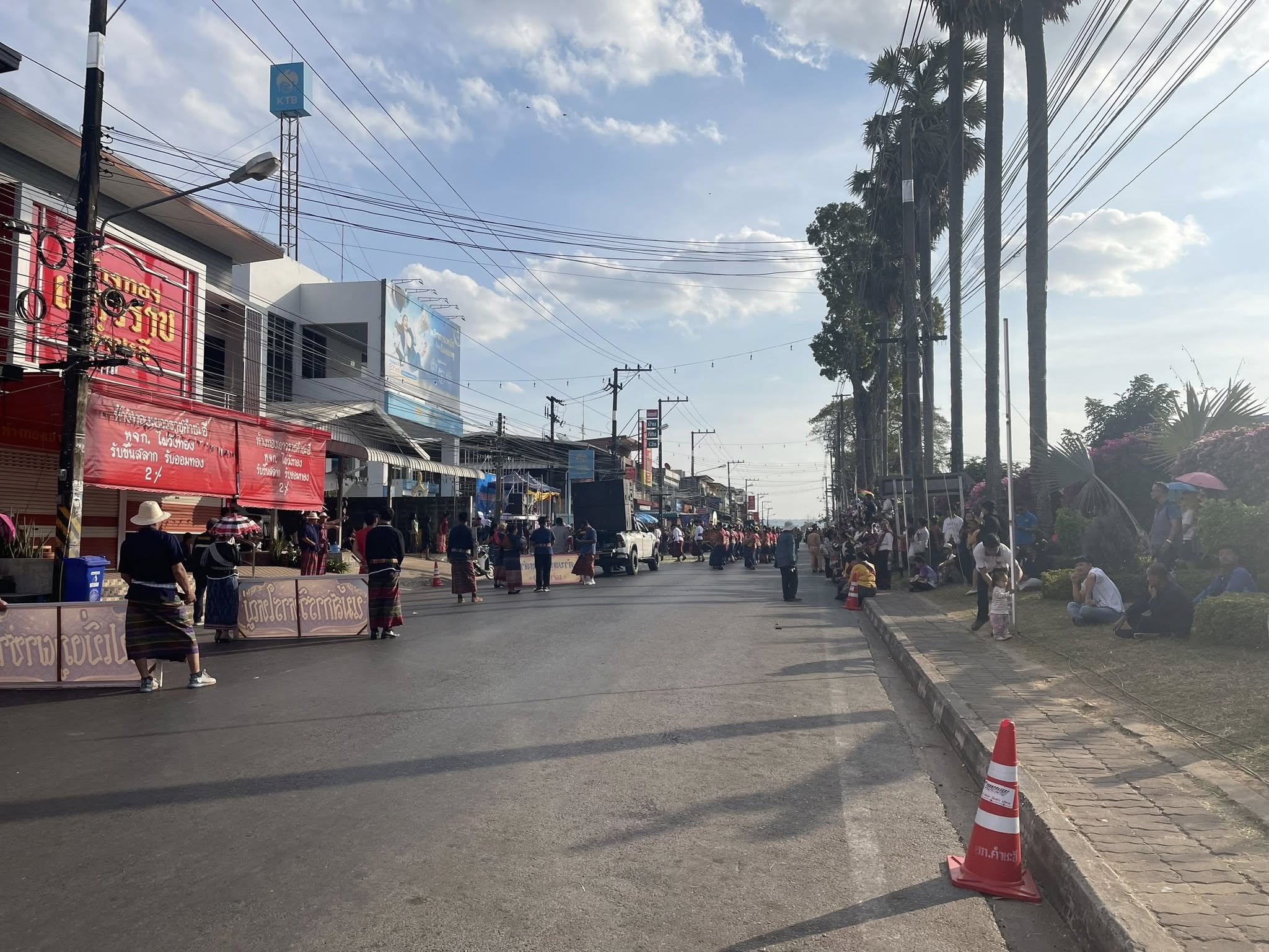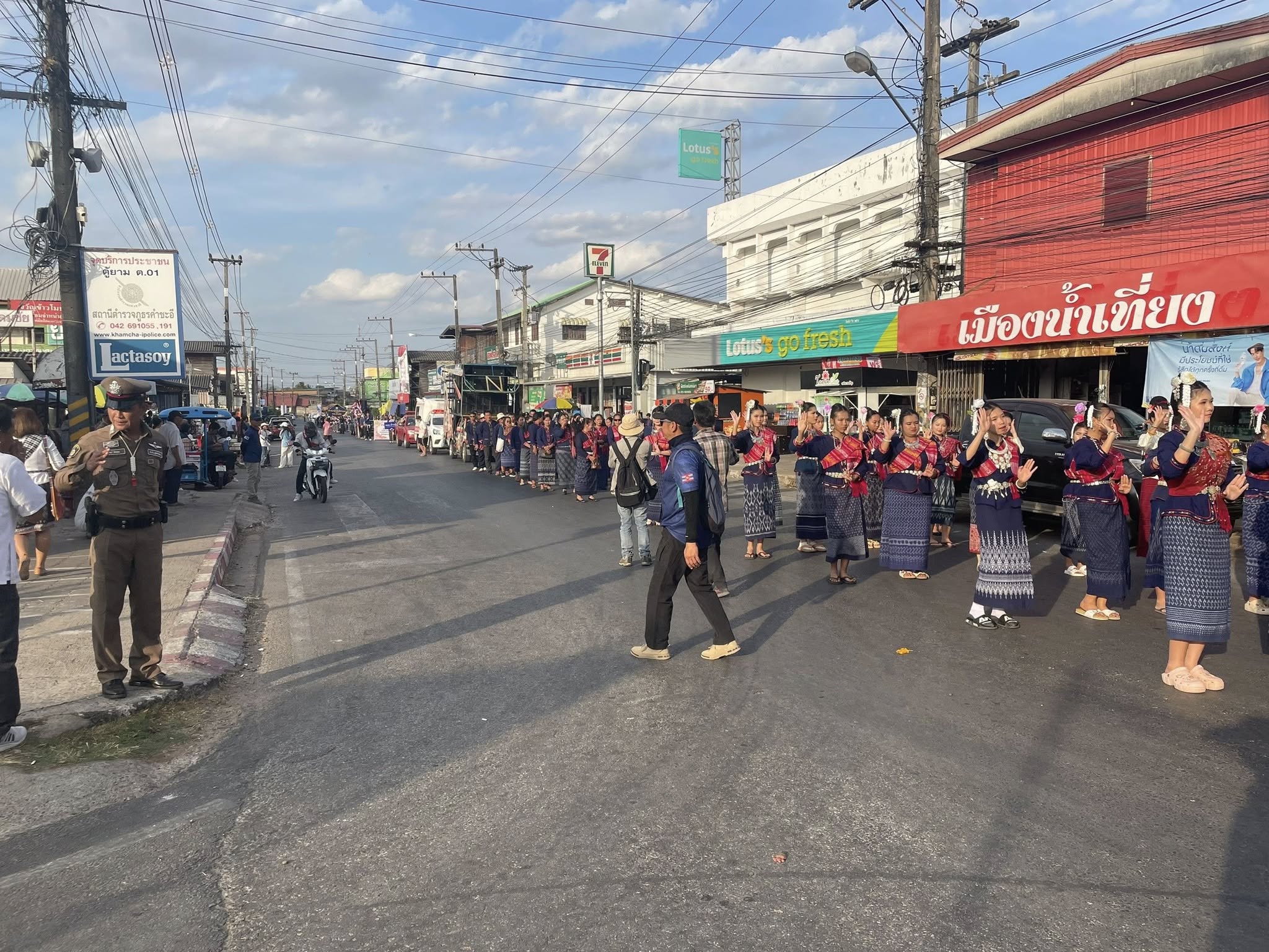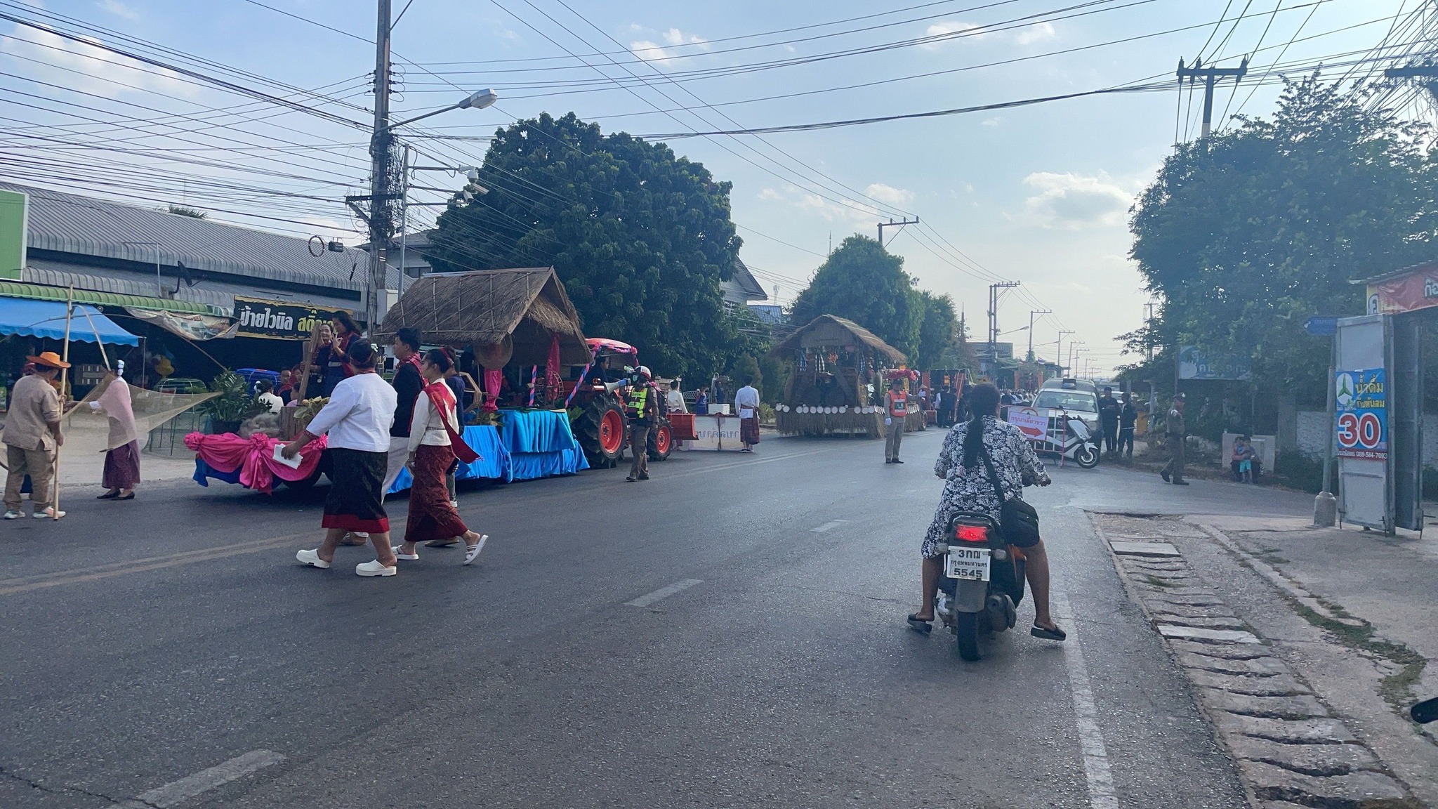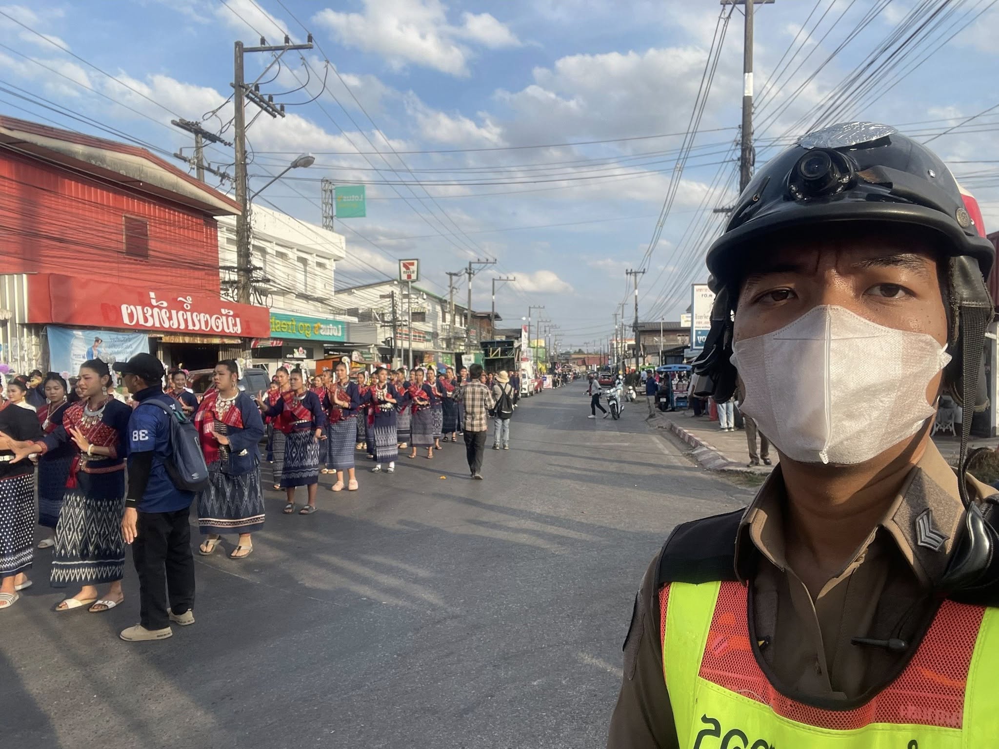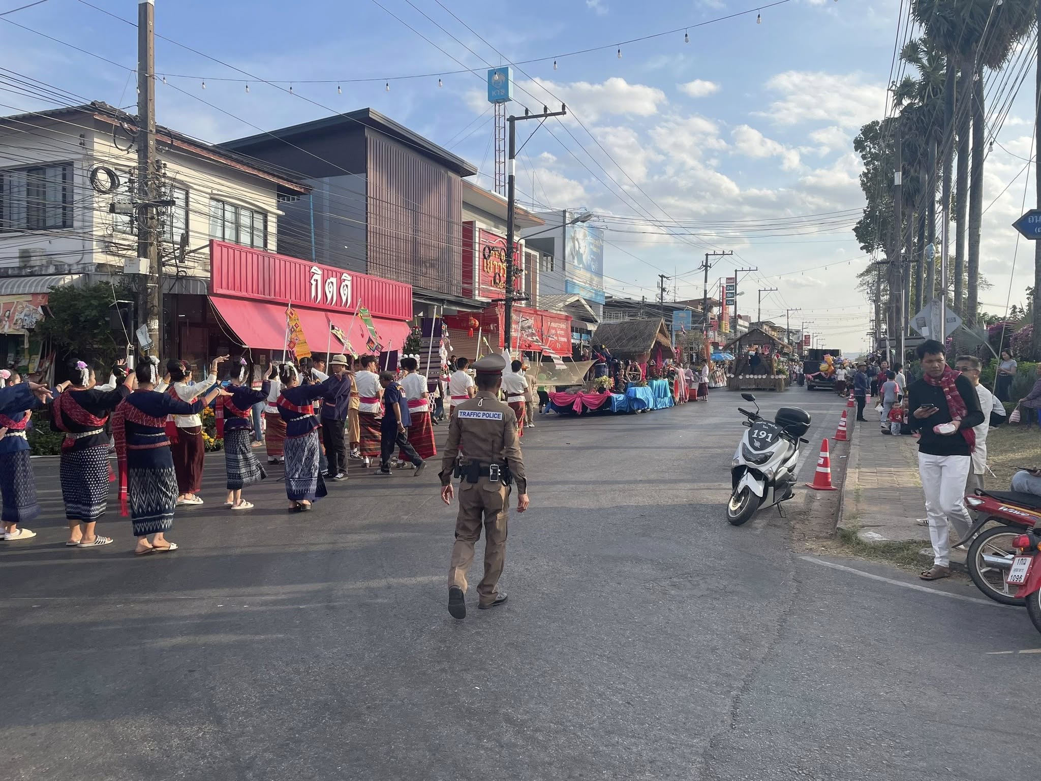 พ.ต.ท.กุลโรจน์ ปัททุม สวป.ฯ พร้อมด้วยเจ้าหน้าที่จราจร ,ฝ่ายปกครองและอปพร. อำนวยความสะดวกด้านการจราจรขบวนแห่“งานออนซอนคำชะอี ประจำปี 2568